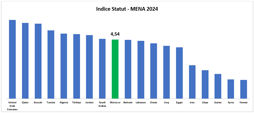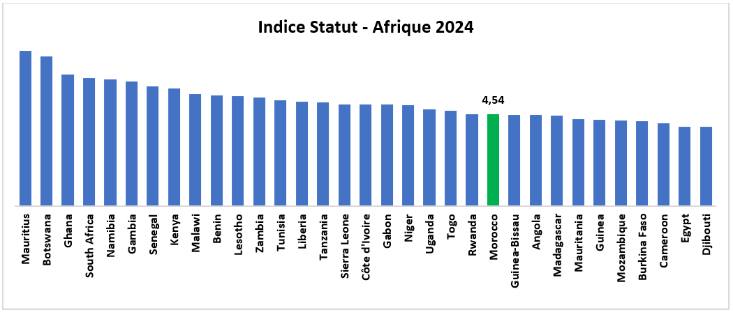 • Sur l’Indice de Statut, le Maroc se positionne à la 87e place au niveau mondial, 24e en Afrique et 9e dans la zone MENA.