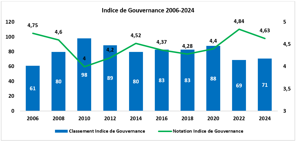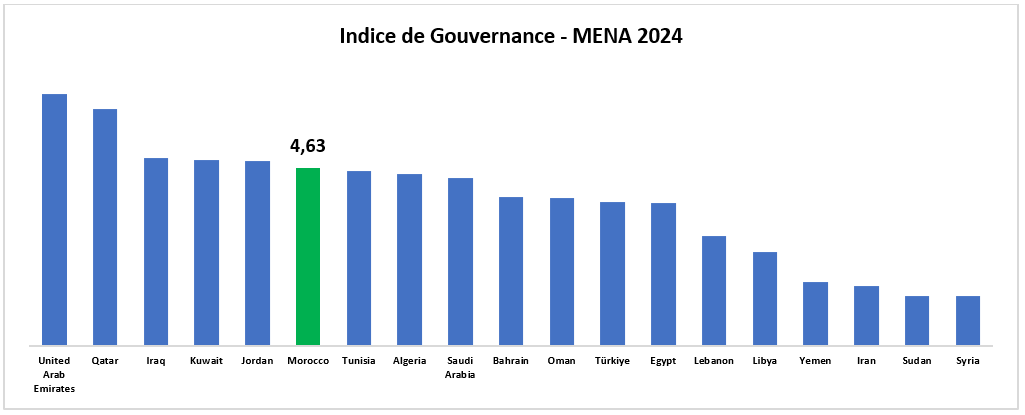 • Sur l’Indice de Gouvernance, le Maroc se positionne à la 69e place au niveau mondial, 23e en Afrique et 6e parmi les pays MENA.