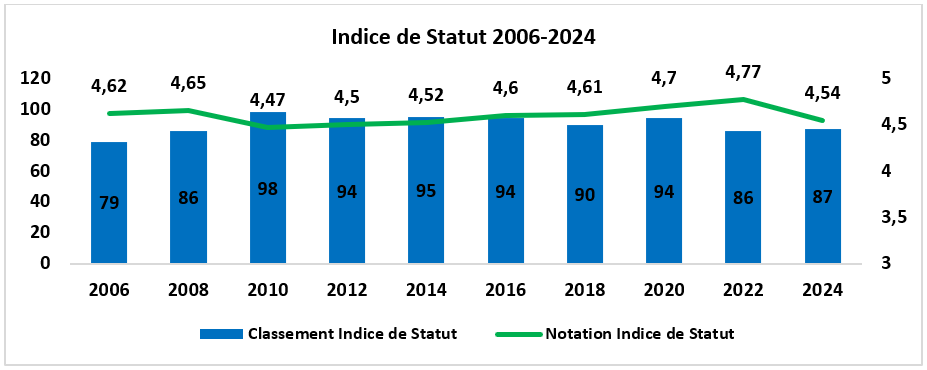 • Le Maroc a perdu une place sur l’Indice de Statut et 0.23 point, en passant de 4.77 en 2022 (86e/137) à 4.54 (87e/137) en 2024.